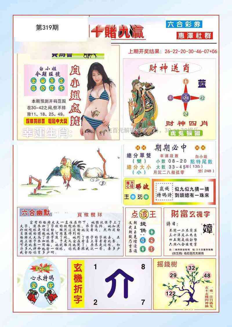 | 319期:九肖【猴鸡狗虎牛马蛇鼠猪】开:鸡45准 |